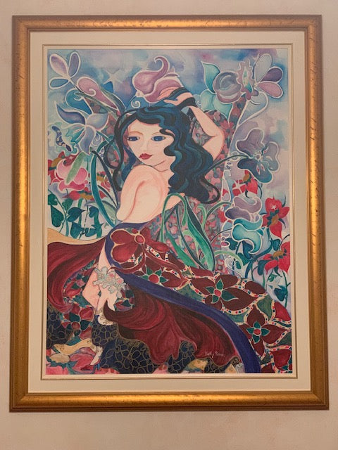 there is so much going on in this water color from Poitras. Is it sadness, longing, loss, contemplation, perhaps resignation or simply waiting for her love to arrive and imagining ... ? Kathy embraces the feminine figure and the hot tropics in Paradise III