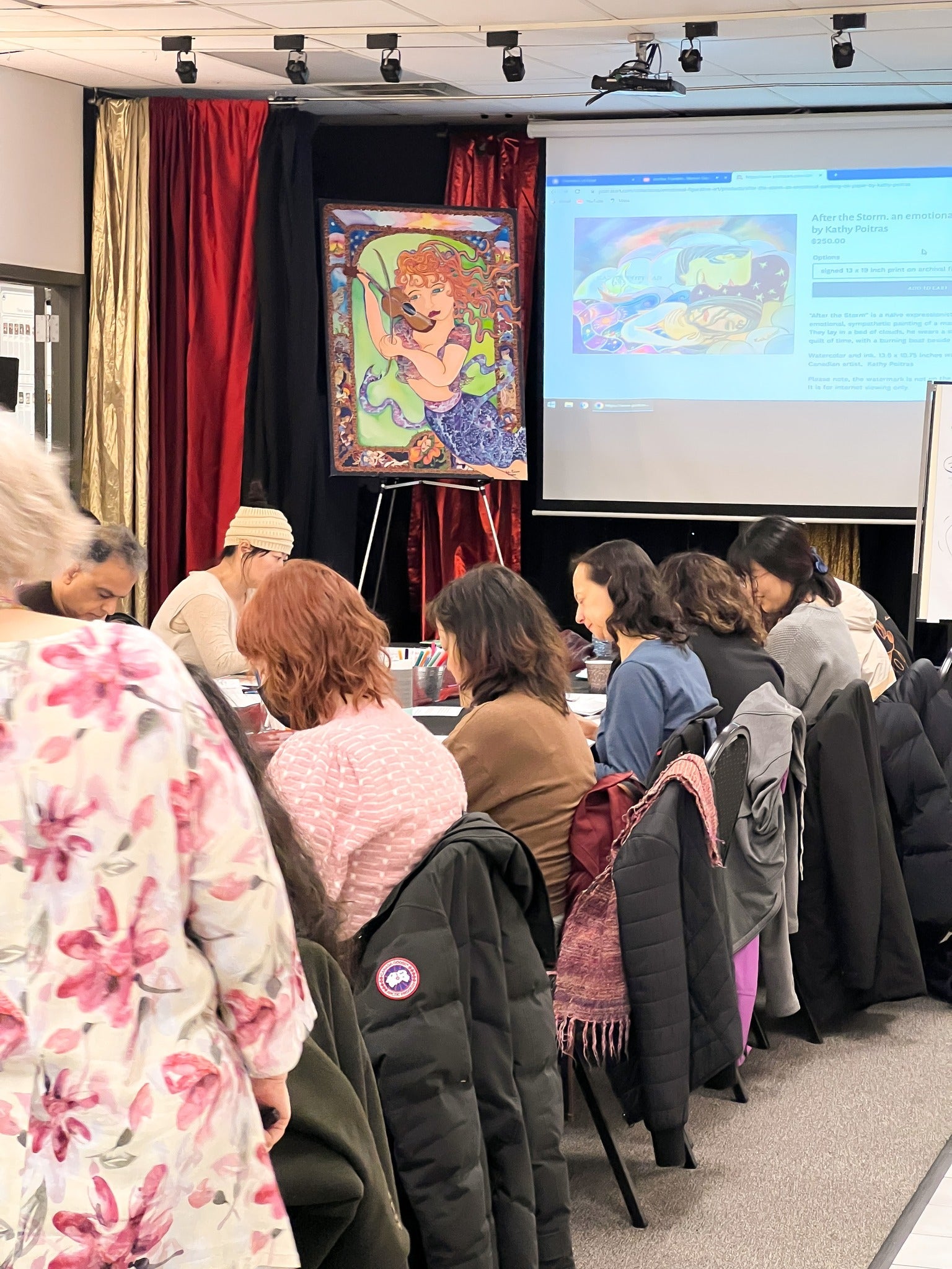 "Thank you! Big appreciation for the space and the materials provided. I wish there was a bit more time to get through the dynamics. Maybe smaller thumbnails? The size of the paper made it feel necessary for a longer amount of time to fill the page. Seeing Kathy's paintings was very inspiring. Loved it. Would happily attend another. HEART Suze