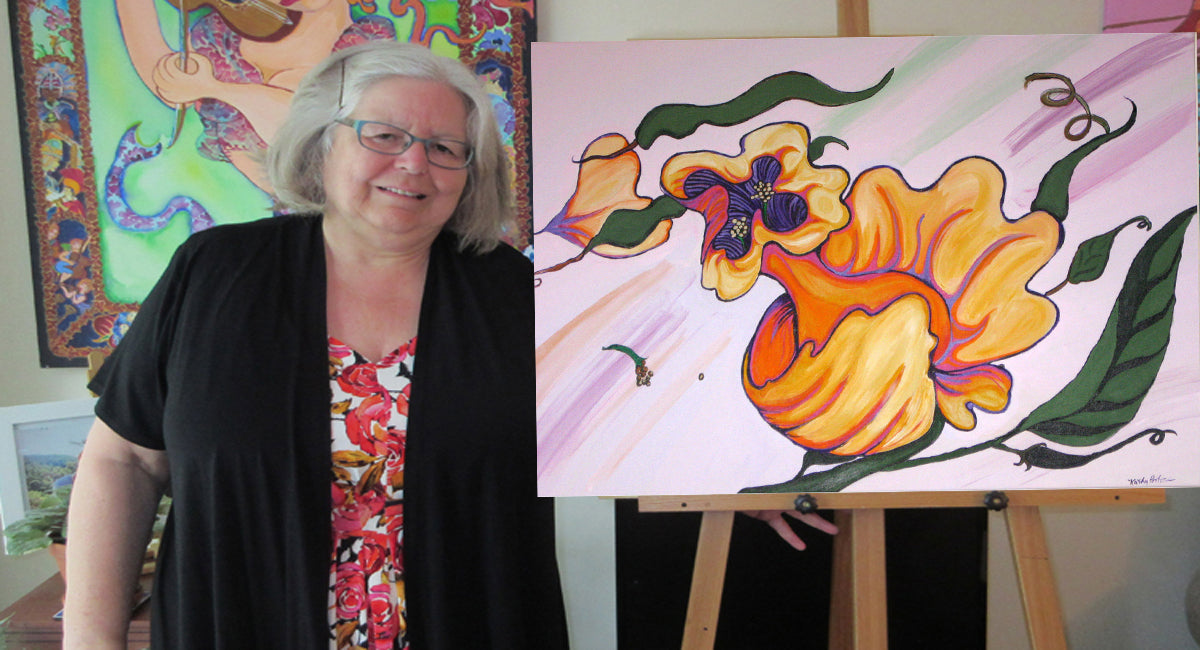 “The Defiant One” by Kathy Poitras is a bold, expressive celebration of resilience and individuality. At its center blooms a fantastical flower, its oversized petals unfurling in radiant yellows and oranges, edged with fiery curves that suggest motion and strength. A rich purple core anchors the composition, dotted with delicate white stamens that add contrast and intrigue.